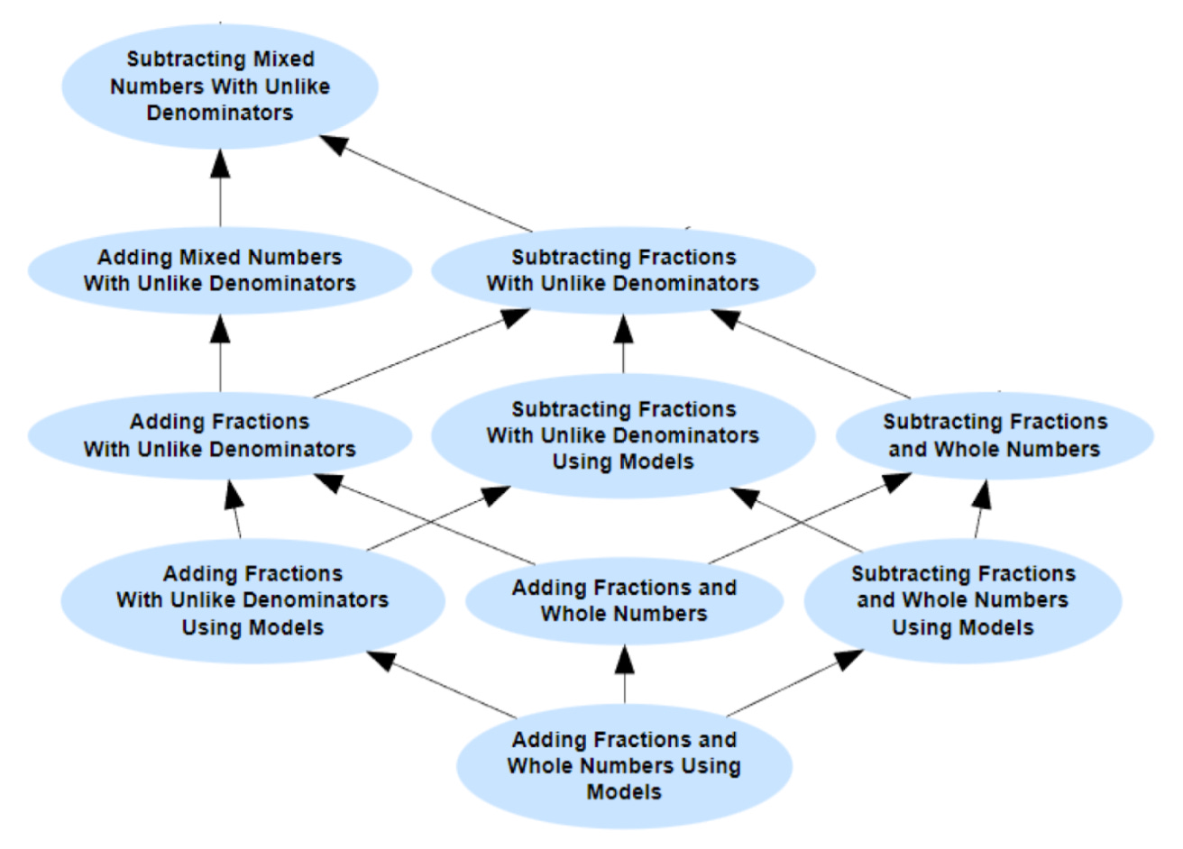 The Math Academy Way introduces another useful concept: the knowledge graph. It’s quite intuitive that one must know requisite skills to perform a complex skill, that lacking automaticity and confidence with requisite skill makes complex operations frustrating, and that missing those requisite skills makes complex operations impossible. Math Academy has created a map that graphs what math skills are foundational to other skills. For example, in order learn to subtract fractions with unlike denominators, you should be able to add fractions with like denominators.
