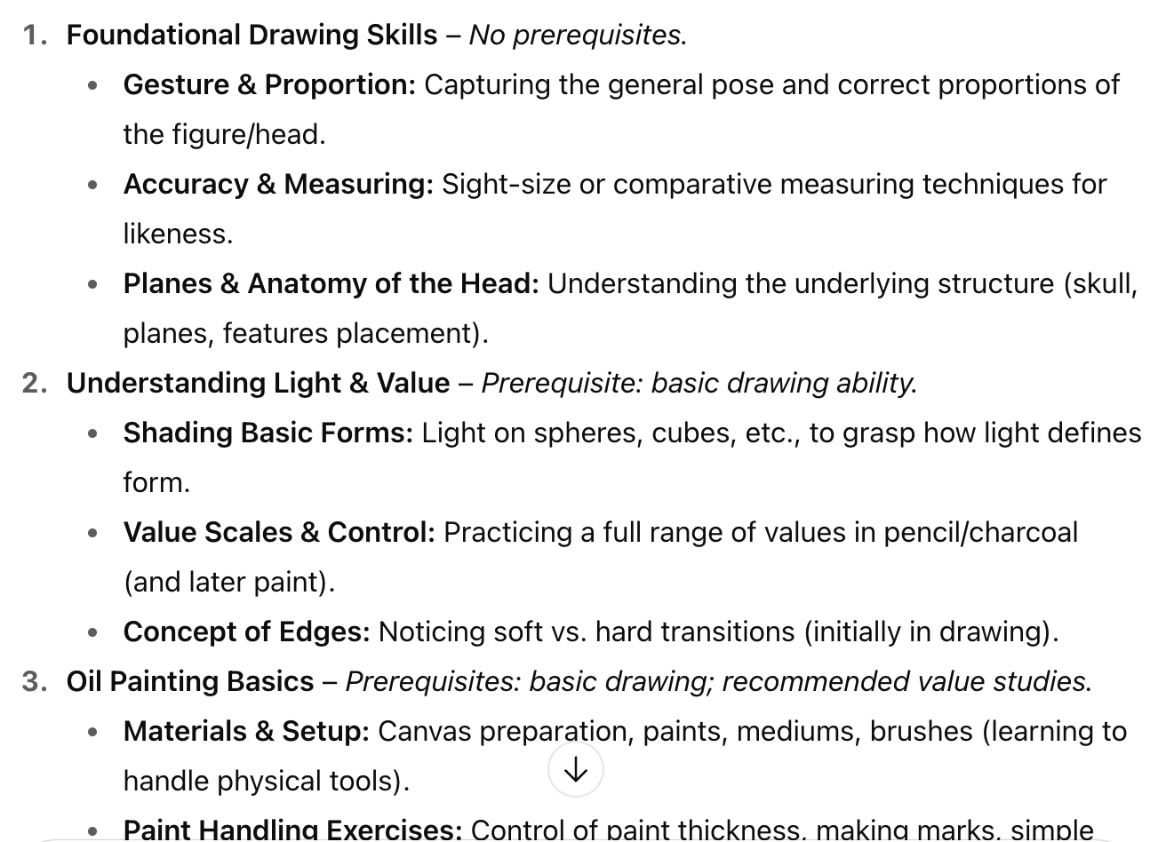 “So I’ve discovered that in order to paint portraits in oil, one must first understand portraits and oil paint; wow, genius! Thanks for writing this book review!” But consider it backwards: if your paintings look bad, it could be because the colors are bad, or the figures are bad. If your colors are bad, it could be because you don’t understand hue, or you don’t understand value. Having a detailed knowledge graph gives you a scaffold of skills to practice as you progress forward and a map to look backwards on when troubleshooting.