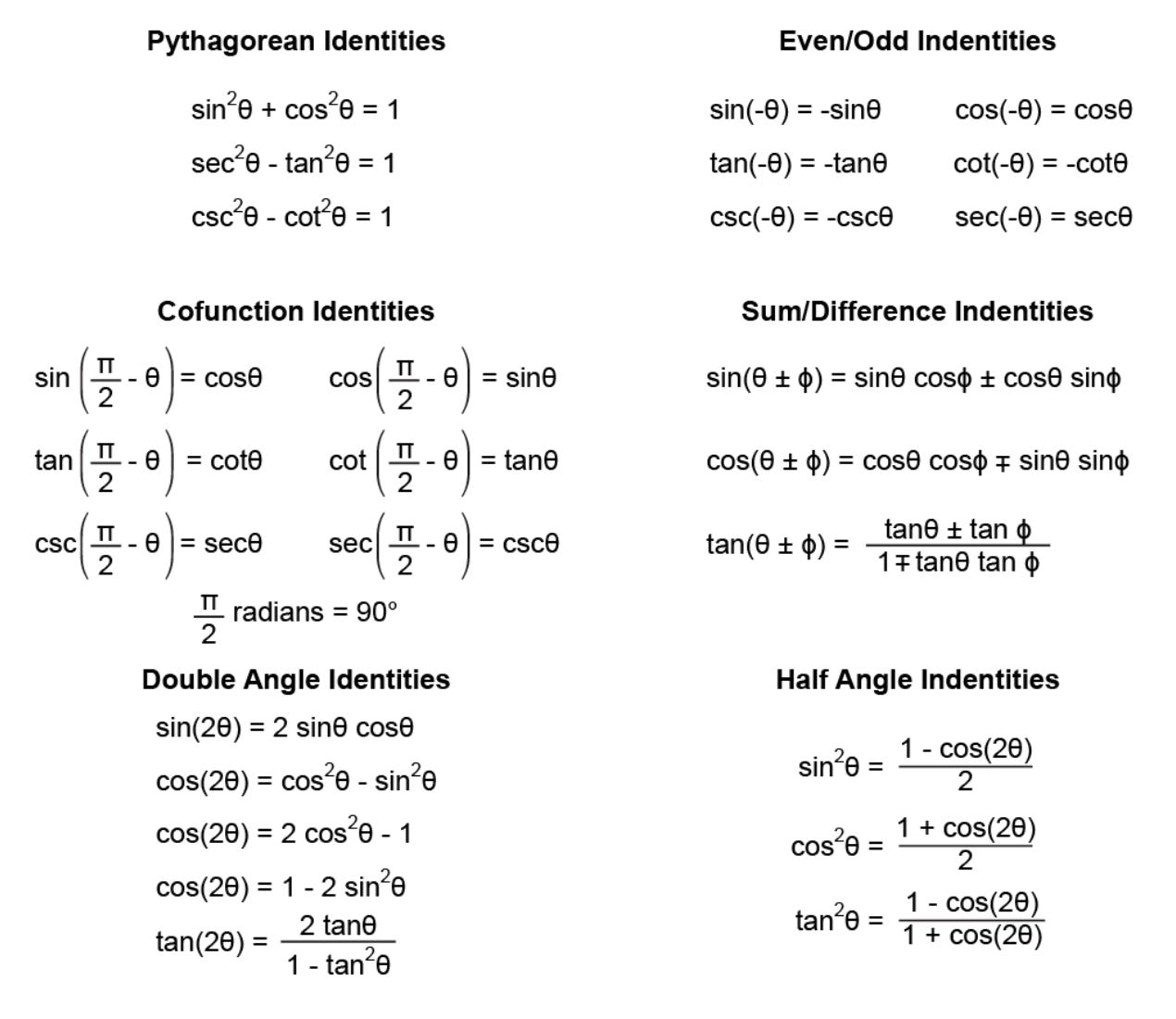 I thought, “I have a deep understanding of trig, and so if faced with e.g. sin(-θ), I can visualize the triangle in my head and realize that it’s equal to -sinθ. I will re-derive these identities from scratch during a test.” But it never really worked out that way. This is the trig equivalent to decoding a sentence letter by letter on the fly. It takes a lot of memory and brain power, and you can’t spot these patterns in a problem if you don’t know the identities. I always felt it was unfair when a solution relied on a double angle identity “trick.” My virtuous and pure, unmemorized knowledge didn’t seem to be sufficient during the exam2.